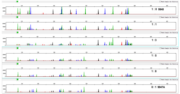 法医样品大多为混合物,本研究将一个男性DNA样本和一个女性DNA样本按照不同的比例混合进行19X-STR多重系统检测,结果如图2所示,即使在1:8的比例下也可以检测到全部的X-STR位点,表明19X-STR多重分析系统可适用于两个不同个体的混合DNA样本的基因分型。