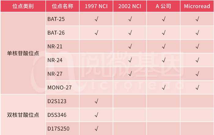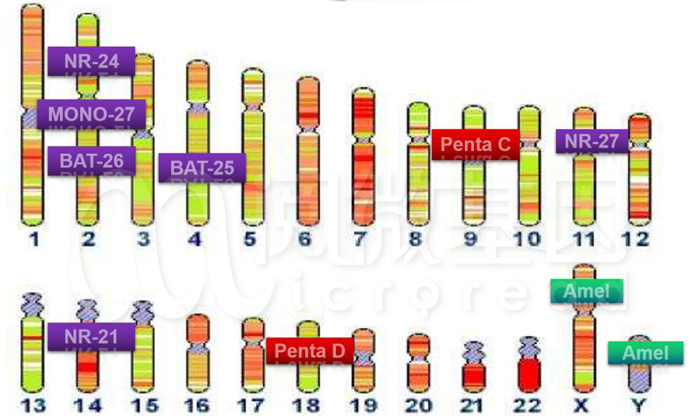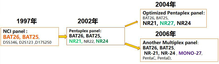 早在1997年,在美国国家癌症研究所(National Cancer Institute,NCI)提出了5个微卫星的评价系统,包括:BAT-25,BAT-26,D5S346,D2S123,D17S250(2B3D),其中D5S346,D2S123,D17S250为双核苷酸微卫星。
