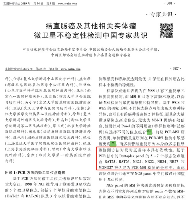 2019年结直肠癌及实体瘤MSI检测专家共识指出:基于PCR法中的pentaplex panel的5~7个标志位点组合BAT25、BAT26、NR21、NR24、NR27、MONO27和NR22被认定为PCR–MSI检测的金标准。