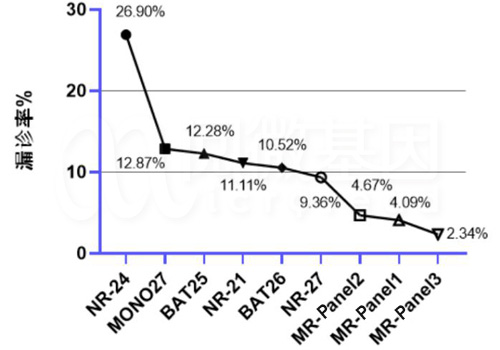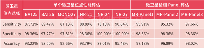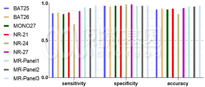 阅微基因参考A公司的体系构建了MR-Panel1(无NR-27),参考Bethesda推荐的pentaplex体系构建了MR-Panel2(无MONO-27),整合了A公司和pentaplex体系构建了MR-Panel3(6单核苷酸核心位点),比较3个不同panel的检测准确性和特异性。