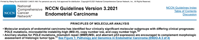 2020 ESGO/ESTEO/ESP子宫内膜癌患者管理指南推荐所有的EC患者都进行分子分型检测,尤其是高级别肿瘤。建议对于I-II期EC,对于POLE突变型,应考虑省略辅助治疗(证据等级:III;推荐等级 A)[9]。