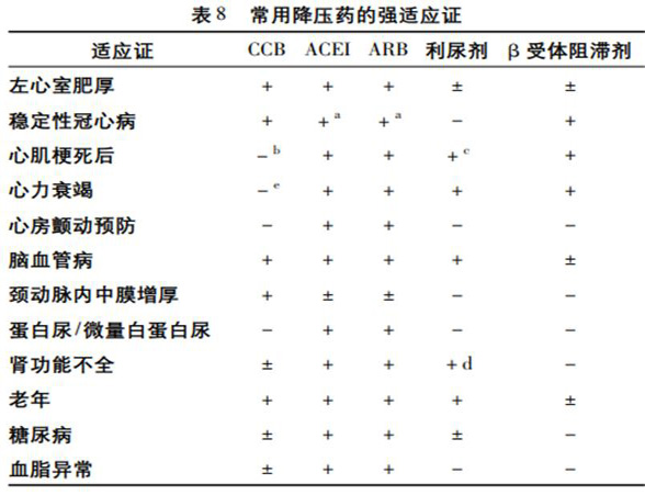 ② 降压药物治疗,降压药物治疗的时机: 在改善生活方式的基础上,血压仍≥140/90mmHg和(或)高于目标血压的患者应启动药物治疗。常用的五大类降压药物包括钙通道阻滞剂(CCB)、血管紧张素转化酶抑制剂(ACEI)、血管紧张素受体拮抗剂ARB、利尿剂和β受体阻滞剂五类,以及由上述药物组成的固定配比复方制剂。