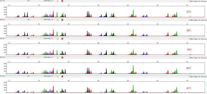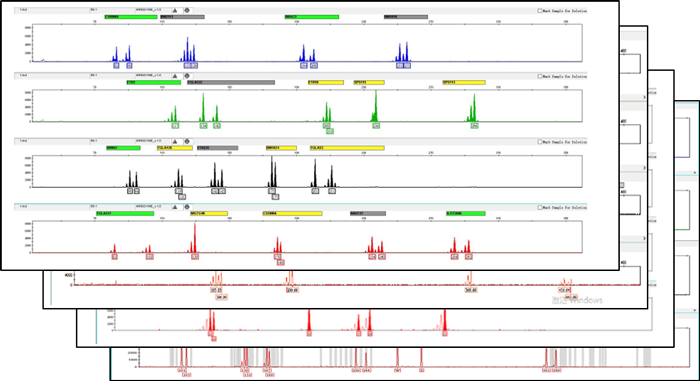 阅微基因的核心技术平台——“中通量荧光PCR-毛细管电泳平台”对中小Panel(5~40位点)检测具有高度优势,搭配不同通量基因分析仪的自动进样功能,日检测样本量最高可达4500份,相当于单日完成22,500~180,000个标记检测;同时对样本质量的要求低,能满足多类型样本上机检测,包含口腔拭子、毛囊、血液、血痕/干血斑、精液等,并支持血痕/干血斑样本免提取直接扩增。产物长度在500bp范围内可实现单碱基分辨率,检测结果下机数据文件导入分析软件,分型结果一目了然,实验结果准确可靠。