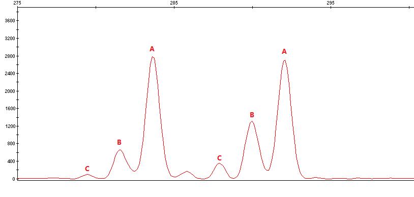 图3 杂合子stutter峰示意(标记A为主峰,标记B和C为影子峰)