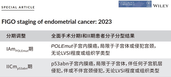 近期大家期待已久的2023年子宫内膜癌FIGO分期已经发布,推荐对所有子宫内膜癌进行完整的分子分型(POLEmut、MMRd、NSMP,p53abn),如果已知分子亚型,在FIGO分期中添加代表分子分类的字母“m”和下标分子亚型,当分期为I期和II期的肿瘤,分子分型为p53abn或POLEmut时,会导致肿瘤分期的上调或下调(IICmp53abn或IAmPOLEmut)[1]