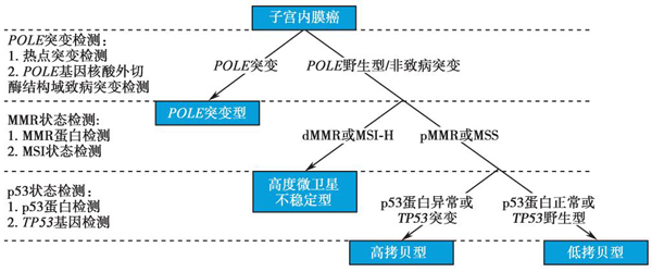 2015年,Talhouk等提出ProMisE分型方法,采用错配修复蛋白(MMR)、p53免疫组化和POLE基因突变检测,将子宫内膜癌分为4个亚型,该分型与TCGA分型高度一致[5]。而2016年,Stelloo等在ProMisE分型的基础上,结合L1CAM高表达(>10%)、CTNNB1外显子3突变和淋巴血管间隙浸润,进一步提出Trans-PORTEC分型,对中高危患者进行精准的风险分层[6]