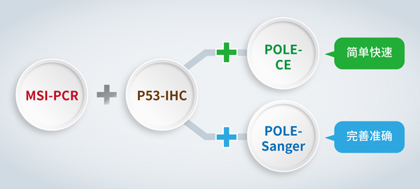 为了分子分型更好的运用到子宫内膜癌的临床应用中,分子分型的检测至关重要,《子宫内膜癌分子检测中国专家共识(2021年版)》优先建议POLE基因热点突变检测(Sanger测序)、MMR蛋白检测(免疫组织化学法)/MSI检测(PCR法)和p53蛋白检测(免疫组织化学法)进行分子分型。