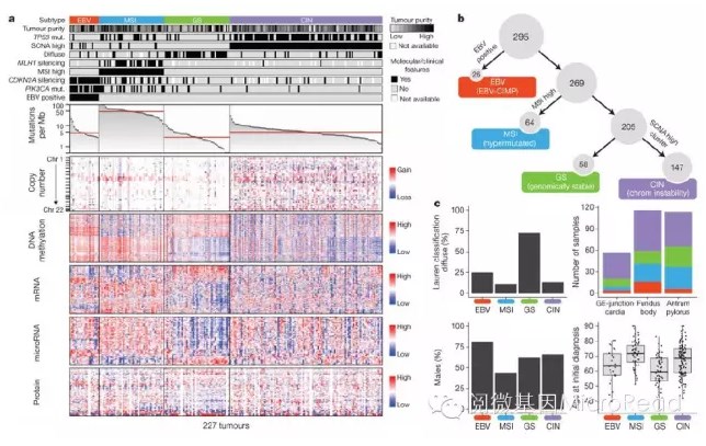 该研究首次提出了胃癌的分子分型,有助于指导胃癌病人靶向药物的选择。但并没有发现该分型中不同分子亚型的生存时间和复发率有显著性差异,文中所使用的样本也大都来自欧美国家。