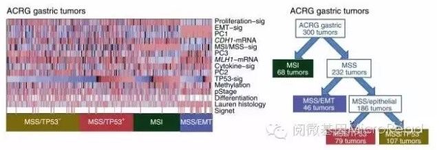 2015年亚洲癌症研究组织(ACRG)对来源于韩国三星医学中心的300例肿瘤标本进行分析,对表达数据采用主要组成成分分析法并且与一些预设的基因表达特征进行比较(表皮间质转移EMT、微卫星不稳定性MSI、细胞因子通路、细胞增殖、DNA甲基化、TP53活性和胃组织等),将胃癌分为MSS/EMT、MSI、MSS/TP53+和MSS/TP53-这四种亚型。在之前已报道过的胃癌群体中也证实了这四种分子分型的存在,这预示着这一分子分型在其它的胃癌群体中也同样存在。