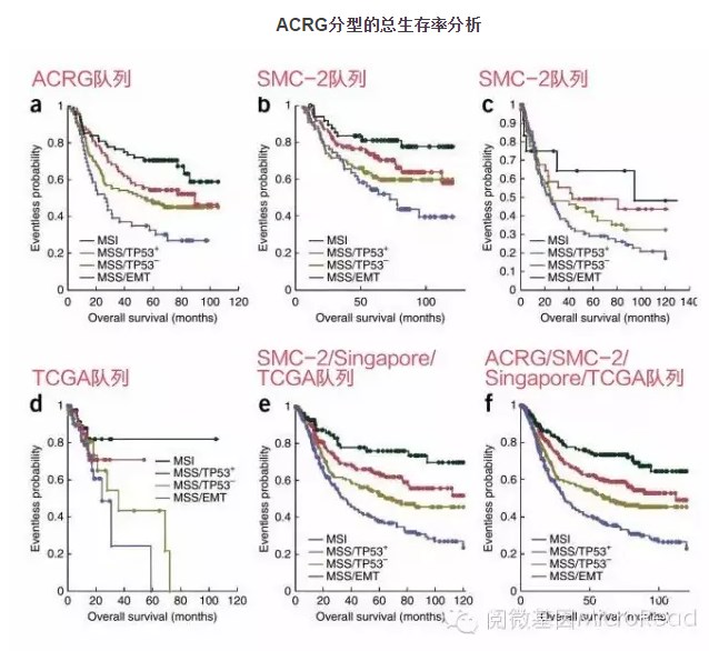 研究人员发现,MSI亚型预后最好,其次是MSS/TP53+、MSS/TP53-和MSS/EMT型预后最差。并且将新的分子分型应用于之前发表的SMC-2(2014)、Singapore(2009)及TCGA(2014)三个独立的队列样本进行验证,所有数据都获得了完全一样的预后生存时间结果。见下图: