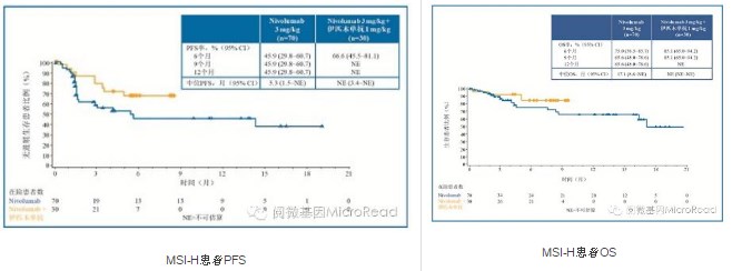 MSI-H 患者用 Nivolumab 单药的客观缓解率为25.5%, Nivolumab 和伊匹木单抗联合治疗的客观缓解率为33%,而 MSS 患者 N1+I3 的客观缓解率只有10%,N3+I1 的客观缓解率为0。用 Nivolumab 单药治疗的 MSI-H 患者中,56%的患者靶病灶缩小,6个月 PFS 为45.9%,9个月 OS为65.6%。Nivolumab 和伊匹木单抗联合治疗的MSI-H 患者,81%的患者靶病灶缩小,6个月PFS 为66.6%,9个月OS 为85.1%。