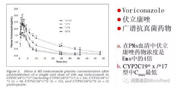 Weiss等人通过对35名口服400毫克剂量伏立康唑的病人进行CYP2C19基因多态性检测,结果显示携带两个弱代谢基因的PM个体的血药浓度是野生型EM患者的4倍,而携带超快代谢*17等位基因的患者血药峰浓度最低。表明不同CYP2C19基因型血药浓度差异显著。