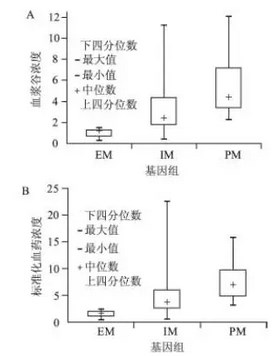 梁峰华等对49名侵袭性真菌感染患者的CYP2C19基因型和服用伏立康唑(200mg q12h)后的血药浓度进行了检测,并对伏立康唑血药浓度检测结果、药物疗效和不良反应与基因分型结果进行统计学分析。结果显示EM组、IM组和PM组的谷浓度和标准化血药浓度均存在显著性差异(P<0.05),且PM组显著高于IM组,IM组显著高于EM组(P<0.05)。