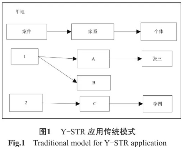 传统的Y-STR 应用模式是一种“案件-家系-个体”模式。如图 1 所示:在相对封闭的区域 ( 如图中甲地 ),根据案件现场生物检材的分析,确定嫌疑人可能家系,从而缩小侦察范围,而后在该家系内对成员进行重点排查,最终确认犯罪嫌疑个体。