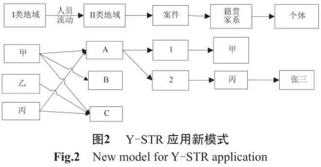 如图 2 所示,人员流动的规律一般是由较为封闭落后地区( I 类地域)流动到经济较为发达地区( II 类地域)。在大量的人员流动中,不同的 II 类地域人员可能来自同一个 I 类地域,这种人员流动整体呈现一定的地域聚集分布特征。实际应用中,假若某人在A地发案,在Y-STR应用筛查中初步比中了 I 类区域中某地某个家系,接着就可以确定出该犯罪嫌疑人的籍贯和姓氏,再配合其它侦查技术手段进一步缩小侦察范围,最终提高破案效率。比如A地发生的案件2中,检出犯罪嫌疑人符合丙地某家系,则在进一步的调查中,可将嫌疑人基因信息在丙地数据库中进行比对,查找其可能来源的家系,最终逐步缩小范围,认定犯罪嫌疑人为张三。