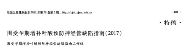 围受孕期增补叶酸预防神经管缺陷指南工作组. 围受孕期增补叶酸预防神经管缺陷指南(2017). 《中国生育健康杂志》 , 2017 , 28 (5)