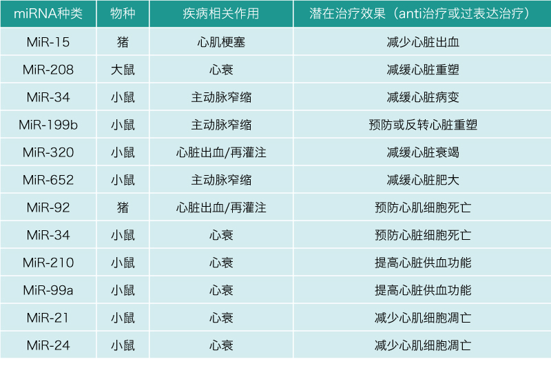 以达到治疗目的。下表对miRNA在心脏疾病上的关联和潜在治疗效果做出了总结: