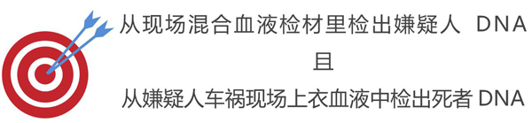 由于现场非常混乱,混合血迹样本中疑因过于微量未检出嫌疑人DNA,同时由于嫌疑人车祸死亡时,还没有换衣服,衣服上的大量血液,推测应该有被害人的。但车祸当天下雨,常规方法没有检出,怀疑已降解。如能从现场混合血液检材里检出嫌疑人的,同时从嫌疑人衣服上血液中检到死者的DNA,可以视为关键证据支持嫌疑人的杀害行为。