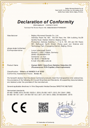 2020年,北京阅微基因技术有限公司(下文简称“阅微基因“)自主研发的体外诊断等系列检测产品CYP2C19/CYP2C9&VKORC1基因检测试剂盒、脆性X综合征检测试剂盒、脊髓性肌萎缩症检测试剂盒等顺利通过欧盟主管当局技术审核,取得了进入欧盟市场的销售通行证,标志着阅微基因的体外诊断试剂产品达到了欧盟国家监管机构的上市要求,对阅微基因集团的发展、尤其是海外市场的开拓带来积极的影响,进一步推进了阅微基因进军国际市场的发展目标。
