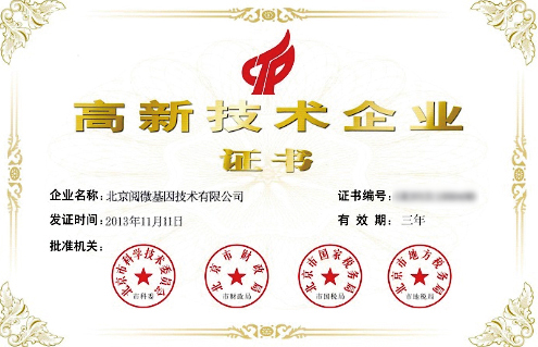 获得由北京市科学技术委员会、北京市财政局、北京市国家税务局、北京市地方税务局联合颁发的《高新技术企业证书》。高新技术企业的通过,标志着公司的科技创新能力再上一个新的台阶,对公司今后的生产、经营将起到很大的推动作用。同时也增强了阅微基因的市场竞争力,增加企业的经济效益,也充分肯定了阅微基因做为生物高科技领先企业所作出的创新价值。