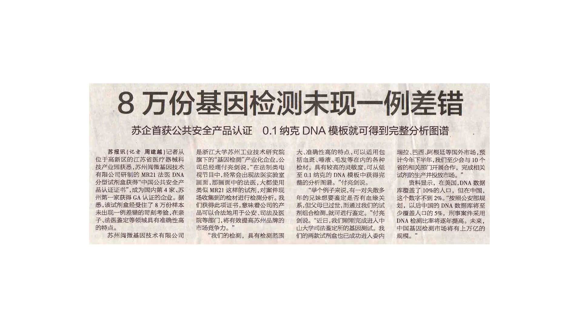 新华网报:苏州阅微基因技术有限公司研制的MR21法医DNA 分型试剂盒获得“中国公共安全产品认证证书”,成为国内第4家、苏州第一家获得GA认证的企业。据悉,该试剂盒经受住了8万份样本未出现一例差错的苛刻考验,在亲子、法医鉴定等领域具有准确性高的特点。