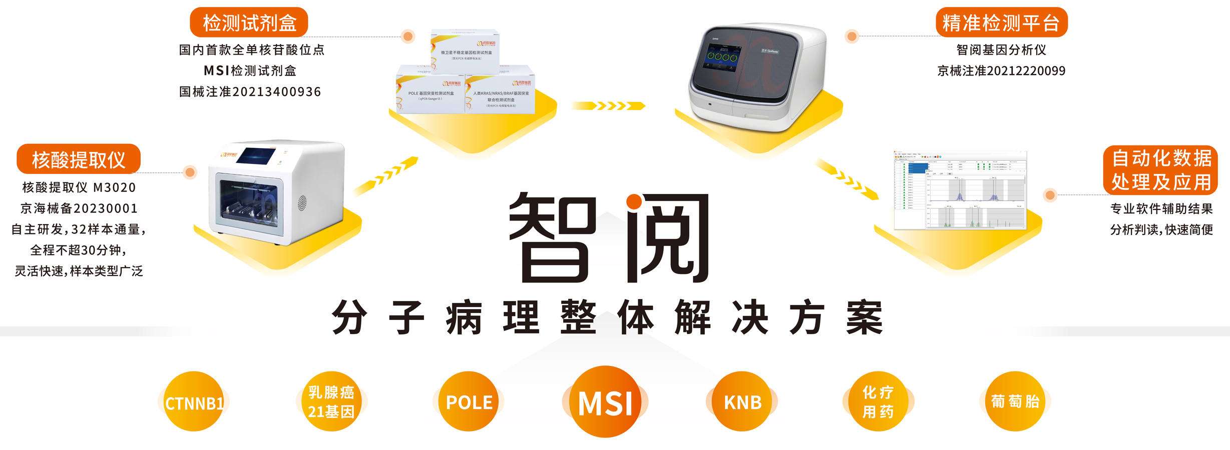 在临床领域,阅微基因专注于肿瘤个体化诊疗、生殖遗传筛查及精准用药指导等方面,现已推出微卫星不稳定性、POLE基因突变、脆性X综合征、染色体非整倍体、心血管用药等自主研发的基因检测产品。其中微卫星不稳定基因检测试剂盒是国内首款全单核苷酸位点检测产品,已获得NMPAⅢ类注册证(国械注准20213400936),并拥有配套智阅基因分析仪(京械注准20212220099)及自动分析软件,为客户提供一站式整体解决方案。