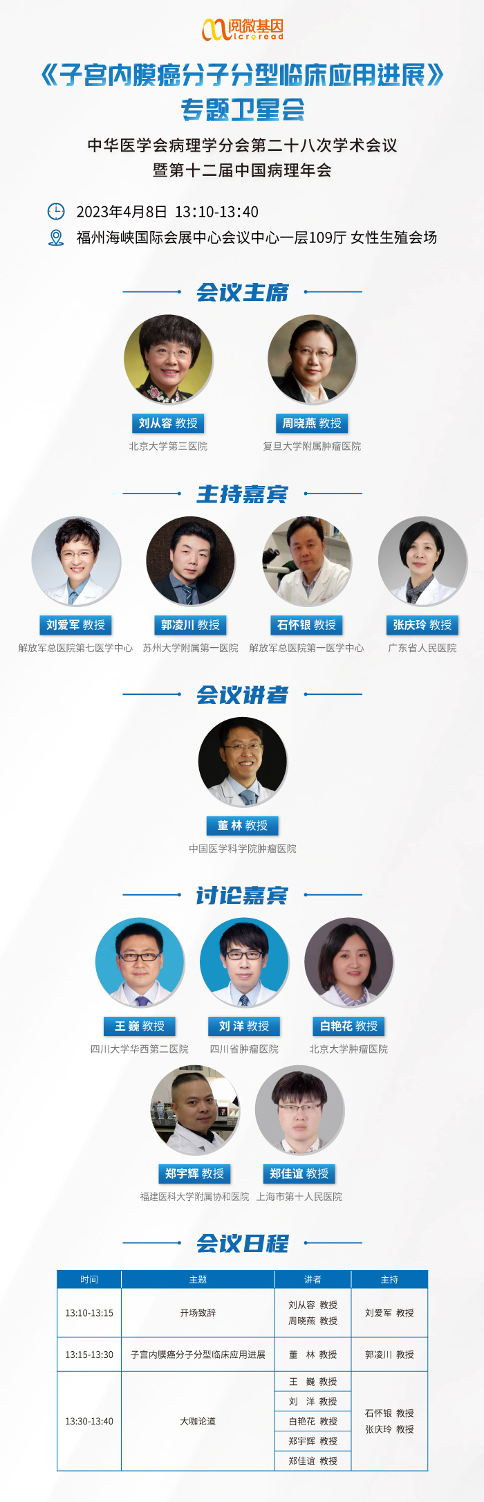 此次病理年会期间,阅微基因将携肿瘤领域整体化解决方案亮相A65展位,并于4月8日13:10-13:40在会议中心一层109厅女性生殖会场举办《子宫内膜癌分子分型临床应用进展》专题卫星会。
