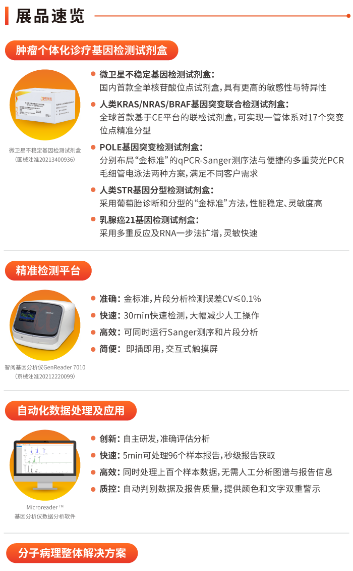 阅微基因多年来持续深耕毛细管电泳(CE)平台,致力于科技创新,以临床和患者需求为导向,自主研发系列创新性产品广泛应用于肿瘤领域,构建了系列简单、快速的产品体系。