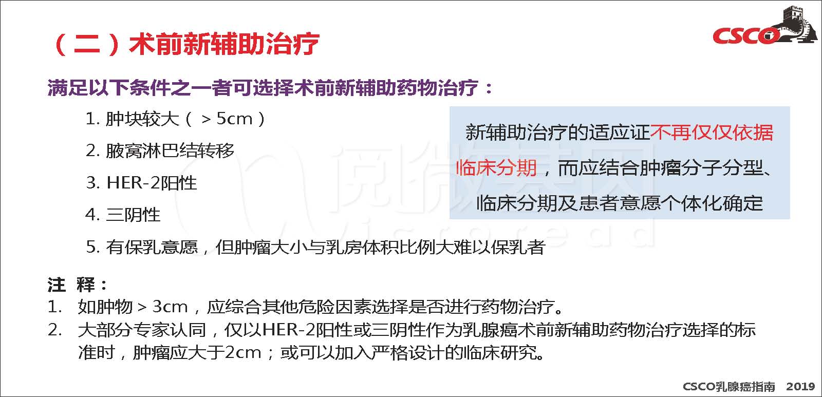 · 在乳腺癌术前新辅助治疗方面,强调仅以HER2阳性或三阴性作为乳腺癌术前新辅助药物治疗选择的标准时,肿瘤应大于2cm;或参加严格设计的临床研究。对于经足疗程新辅助治疗后仍未达到pCR的患者,术后可考虑强化治疗。