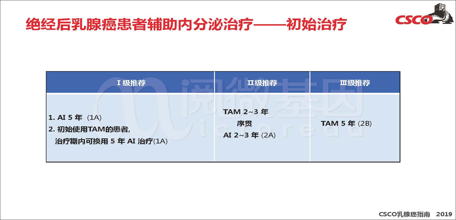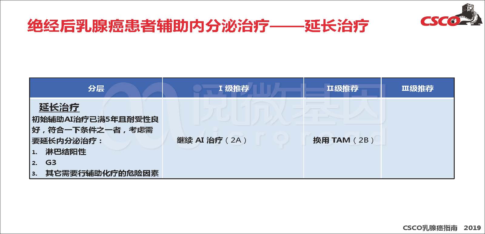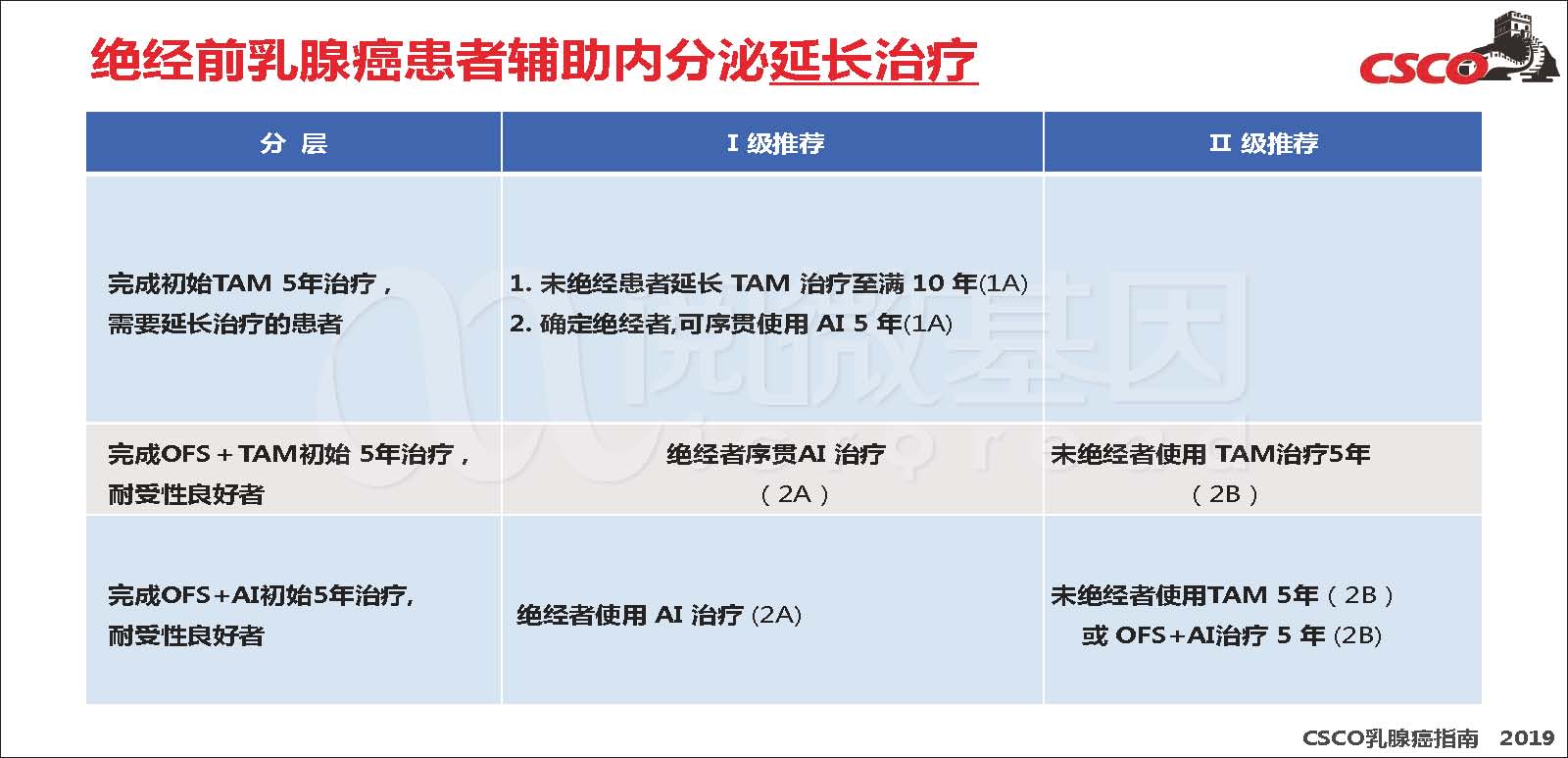 延长治疗完成OFS+AI治疗,耐受性良好者,“绝经者适应AI治疗”由II级推荐调整为I级推荐。