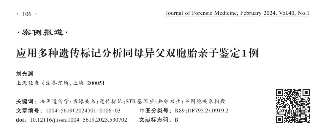 标题: 应用多种遗传标记分析同母异父双胞胎亲子鉴定1例