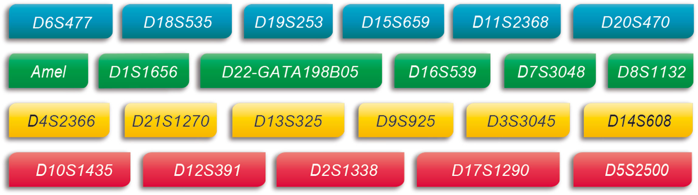 ▶ 采用五色荧光标记技术,一次性检测21个非CODIS位点,1个CODIS位点,及1个Amel性别位点;