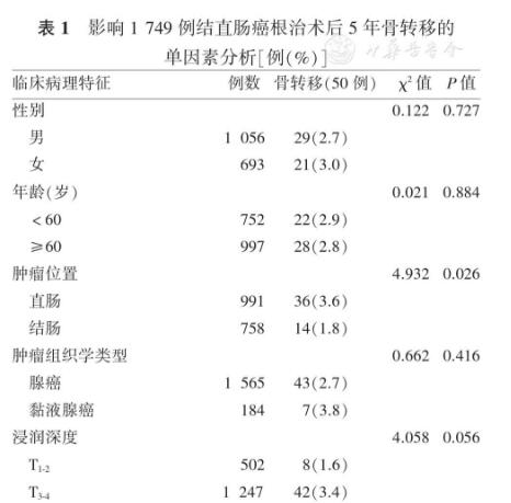 回顾性分析2001年1月至2010年12月间第二军医大学附属长海医院肛肠外科收治的1 749例结直肠癌患者的临床资料,其中50例(2.8%)术后出现骨转移。分别采用χ2检验和Logistic多因素分析模型,对性别、年龄、肿瘤位置、术前血清癌胚抗原水平、肿瘤组织学类型、肿瘤浸润深度、淋巴结转移、是否伴肺转移和伴肝转移等可能影响术后骨转移的临床病理特征,进行单因素和多因素分析。