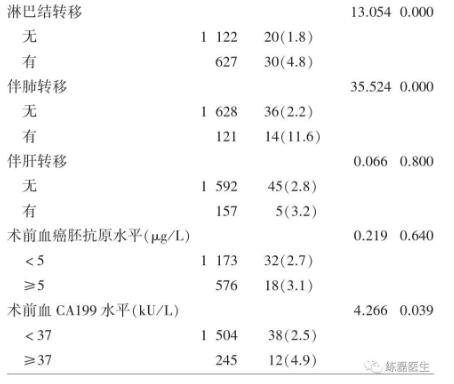 采用SPSS 20.0统计软件处理分析数据。将患者性别、年龄、肿瘤位置、术前血清癌胚抗原(carcinoembryonic antigen,CEA)水平、术前血清CA199水平、肿瘤组织学类型、肿瘤浸润深度、淋巴结转移、伴肺转移和伴肝转移共10项变量纳入单因素分析,采用χ2检验或精确概率法。将单因素分析中P < 0.05的变量纳入Logistic回归模型,进一步行多因素分析,P < 0.05表示差异具有统计学意义。