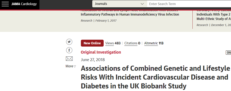 这一成果于6月27日以“Associations of Combined Genetic and Lifestyle Risks With Incident Cardiovascular Disease and Diabetes in the UK Biobank Study”为题发表在JAMA Cardiology杂志上。研究主要作者Pim van der Harst说:“我们知道基因在心血管风险中扮演角色,也知道生活方式影响心血管健康,但我们不知道这两者是如何相互影响的。”