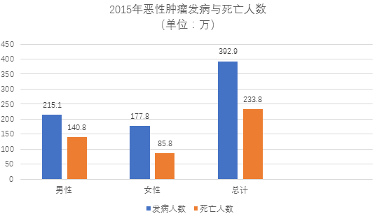 据估计,2015年全国新发恶性肿瘤病例数约为392.9万例,其中男性约为215.1万例,女性约为177.8万例,平均每分钟有7.5个人被确诊为癌症。2015年全国恶性肿瘤死亡例数约为233.8万例,其中男性约为148.0万例,女性约为85.8万例。