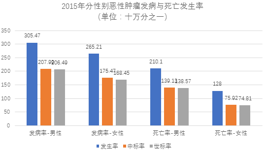 2015年恶性肿瘤发病率为285.83/10万,中标率(中标率:人口标准化率按照2000年中国标准人口结构)为190.64/10万,世标率(世标率:人口标准化率按照Segi's世界标准人口结构)为186.39/10万,累积率(0~74岁)为21.44%。2015年中国恶性肿瘤死亡率为170.05/10万,中标率为106.72/10万,世标率为105.84/10万,累积率(0~74岁)为11.94%。