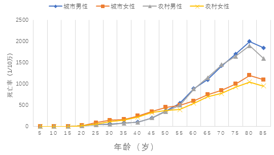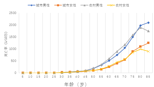 年龄别死亡率变化趋势和发病相似,随年皊增加逐渐上升。男性的年龄别死亡率高于女性。0~39岁人群中,男性年龄別死亡率略高于女性。40岁及以上人群中,同年龄组男性与女性死亡率的差异随年龄的増加而显著增大。城乡人群的年龄别死亡率变化趋势相似。除0~4岁和75岁及以上年龄组农村男性死亡率低于城市男性,其他年龄组农村男性死亡率高于城市男性。20-74岁年龄组农村女性死亡率高于城市女性,其他年龄组城市女性死亡率高于农村女性。