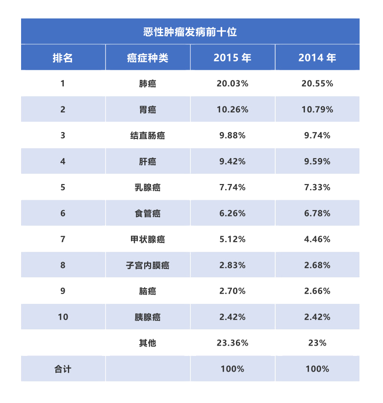 按发病人数顺位排序,肺癌位居我国恶性肿瘤发病首位,估计结果显示,2015年我国新发肺癌病例约为78.7万例,发病率为57.26/10万,中标率为35.96/10万。其他高发恶性肿瘤依次为胃癌、结直肠癌、肝癌和乳腺癌等,前10位恶性肿瘤发病约占全部恶性肿瘤发病的76.70%。与2014年相比,各类高发癌症的顺位完全相同,占比变化不大,甲状腺癌上升相对明显。