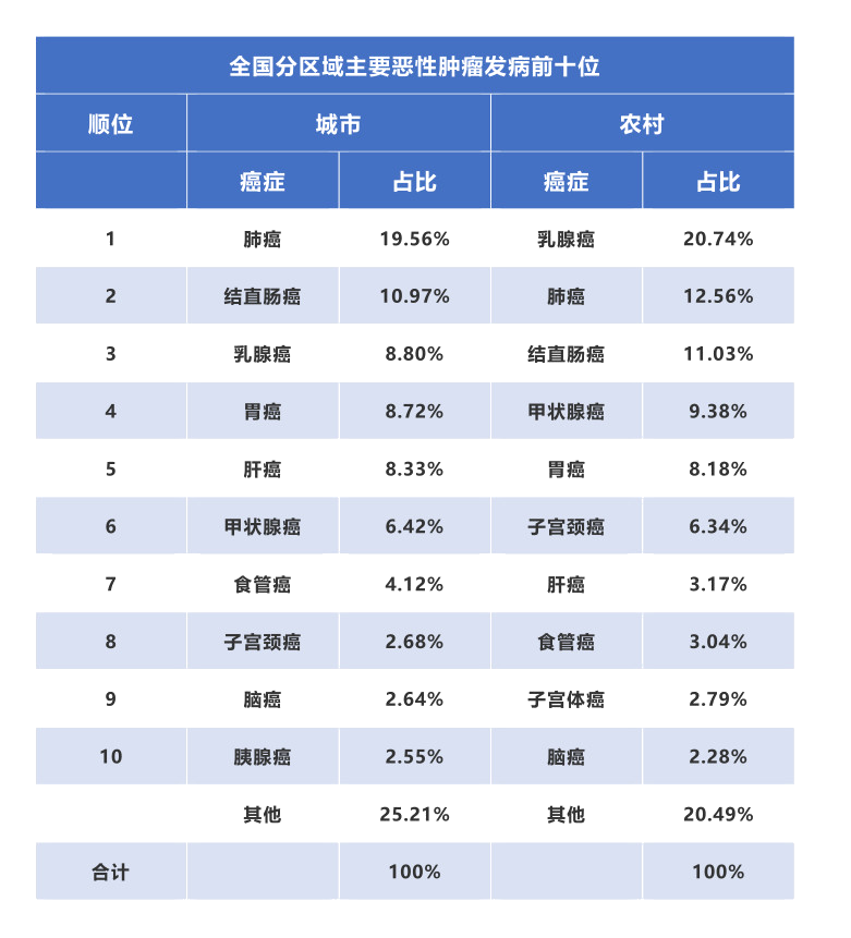 城市地区与农村地区的恶性肿瘤发病顺位有所不同,城市地区主要高发恶性肿瘤依次为肺癌、结直肠癌、乳腺癌、胃癌和肝癌等,农村地区主要高发恶性肿瘤依次为肺癌、胃癌、肝癌、食管癌和结直肠癌等。城市地区与农村地区前10位恶性肿瘤发病分别占城乡全部恶性肿瘤发病的74.80%和79.50%。