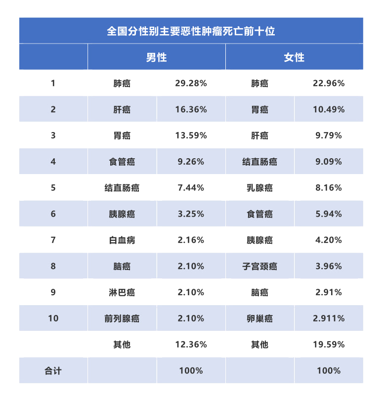 男性和女性的恶性肿瘤死因顺位略有差异。男性依次为肺癌、肝癌、胃癌、食管癌和结直肠癌等,男性前10位恶性肿瘤死亡约占男性全部恶性肿瘤死亡的87.60%。女性主要恶性肿瘤死因顺位依次为肺癌、胃癌、肝癌、结直肠癌和乳腺癌,女性前10位恶性肿瘤死亡约占女性全部恶性肿瘤死亡的80.50%。