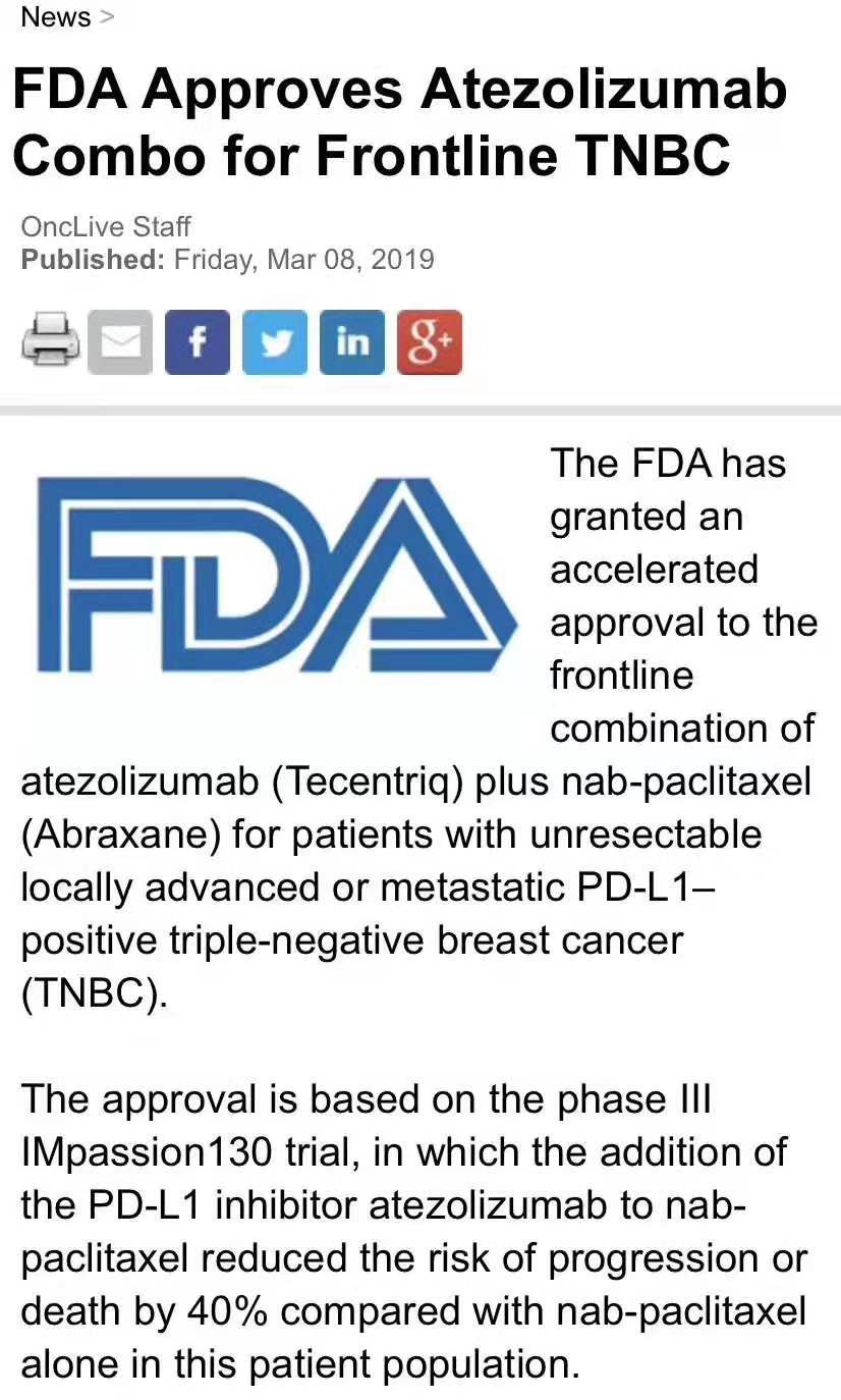 FDA(美国食品和药物管理局)近日加速批准Atezolizumab联合化疗nab-paclitaxel用于一线治疗无法切除的局部晚期或转移性PD-L1阳性的三阴性乳腺癌(TNBC)。该组合的新批准基于多中心IMpassion130试验的安全性和有效性结果(PFS结果),研究在2018年欧洲肿瘤内科学会(ESMO)上发表,同时发表在新英格兰医学杂志上。
