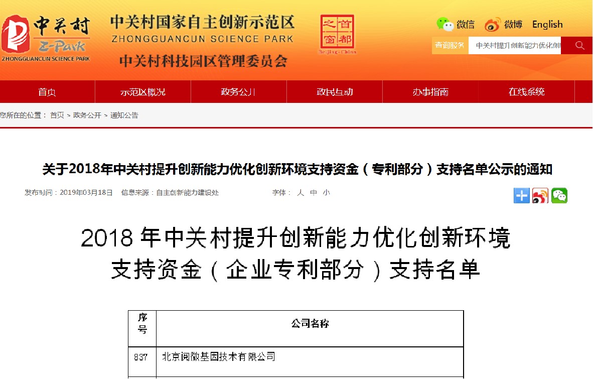 近日,经中关村管委会2019年第4次主任专题会审议,根据《中关村国家自主创新示范区提升创新能力优化创新环境支持资金管理办法》(中科园发〔2017〕11号)和《中关村国家自主创新示范区提升创新能力优化创新环境支持资金管理办法实施细则(试行)》(中科园发〔2017〕42号),给予北京阅微基因技术有限公司发明专利——《检验染色体非整倍体数目异常的扩增组合物及快速检测试剂盒》(专利号:ZL 2014 1 0691461.8)支持资金,相关公示文件发布于中关村科技园区管理委员会官网。