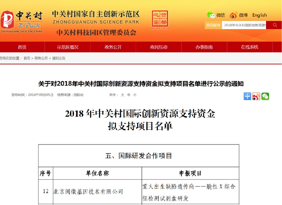 近日,按照《中关村国家自主创新示范区提升创新能力优化创新环境支持资金管理办法实施细则(试行)》(中科园发[2017]40号)的相关规定,经中关村管委会2018年第13次主任专题会审议通过,北京阅微基因技术有限公司的《重大出生缺陷遗传病——脆性X综合征检测试剂盒研发》国际研发合作项目获得支持资金,相关公告公示于中关村科技园区管理委员会官网。
