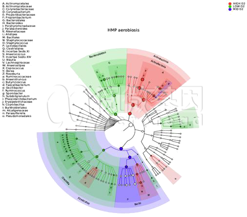 热树(Heat-tree)图在16S微生物的分析中,可以弥补物种阶层累计柱状图的不足,使各个阶层的菌种组成更加能够一目了然,方便同时比对多组或多样本的差异。