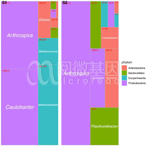 物种Tree-map(树形图)可更加直观的呈现不同分组间物种组成的差异,以及组内各物种的相对丰度比例。