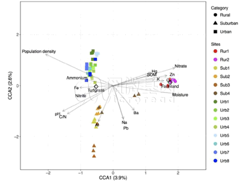 典范对应分析(canonical correspondence analysis, CCA)或冗余分析(redundancy analysis, RDA)是基于对应分析发展而来的一种排序方法,将对应分析与多元回归分析相结合,每一步计算均与环境因子进行回归。CCA/RDA 分析可以检测环境因子、样品、菌群三者之间的关系或者两两之间的关系。(需提供关联因素数据)