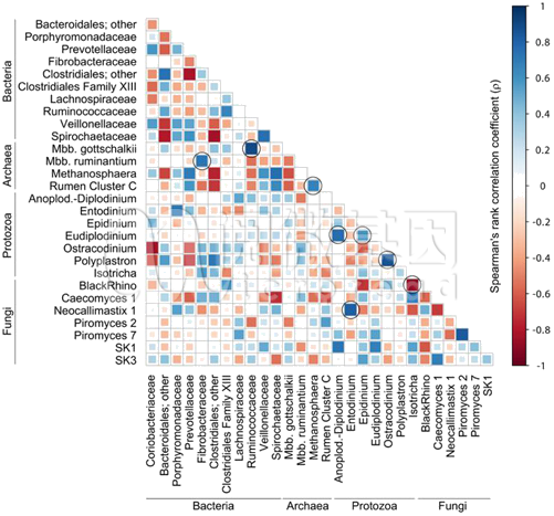 通过绘制优势物种之间spearman相关性热图,可以发现优势物种之间重要的模式与关系,例如正相关或负相关,关联大小等。