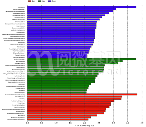 通过LDA分析(线性回归分析)统计不同组别中有显著作用功能的LDA分值,展示了LDA 分值大于设定阈值的功能,即具有统计学差异的功能。柱状图的长度代表显著差异物种的影响大小。