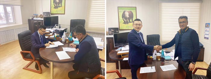 农业部“Asyl-Tulik”JSC负责人Mr.Seisenov Bolat Sekenovich与哈萨克斯坦阅微总经理Mr.Yernazar Rashatbek签署合作备忘录